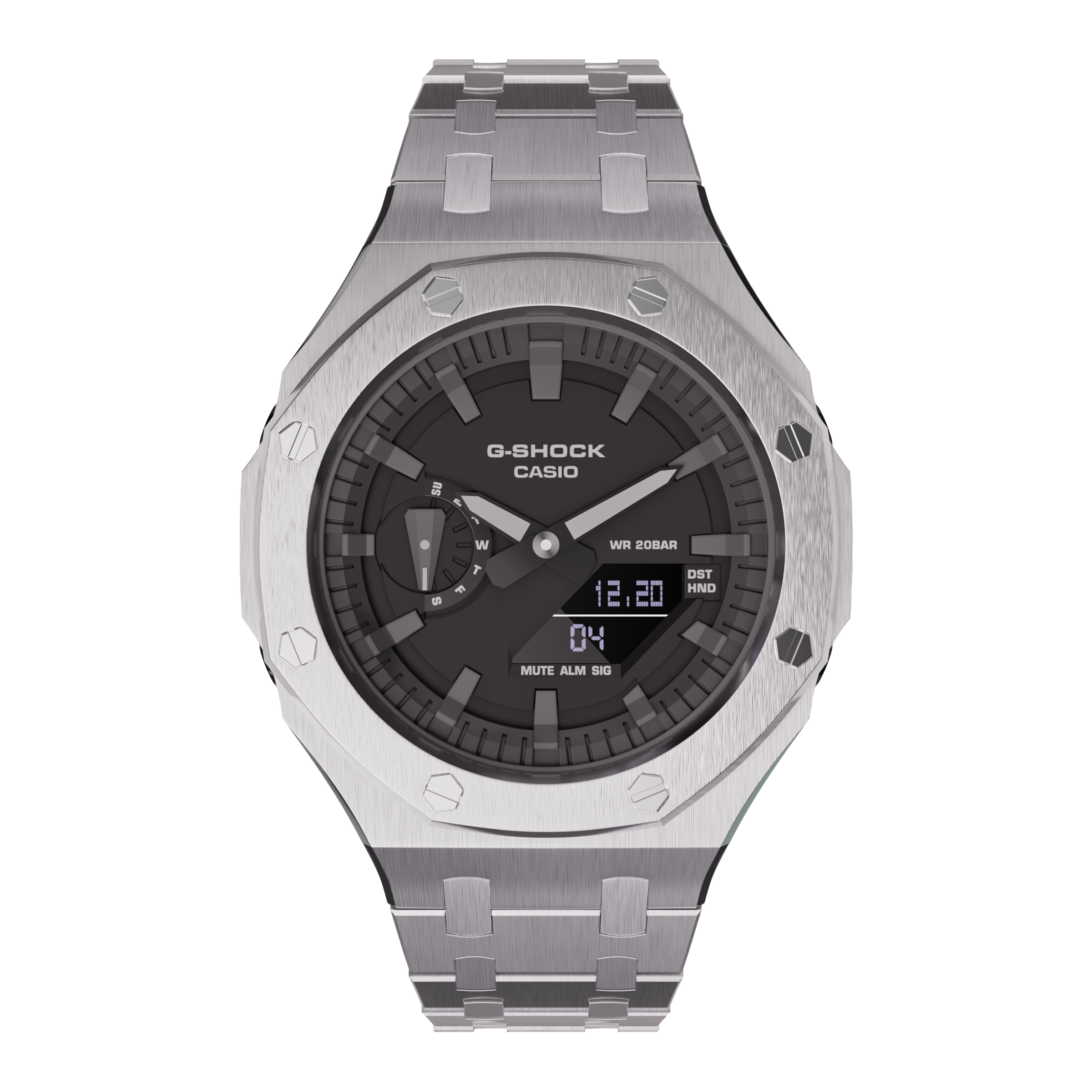 The Casioak Mod Royal Oak Casio G-Shock GA-2100 combines the iconic Royal Oak-inspired design with the legendary durability and reliability of the G-Shock brand. Featuring an all-metal stainless steel band and case, this custom-modified watch is built for strength, style, and versatility. Whether you're on an adventure or at a formal event, the sleek and rugged design ensures you’ll always make a statement.